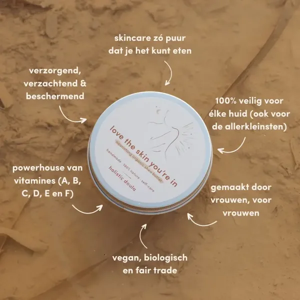 Ook na je zwangerschap komt onze Shea van pas. Het is rijk aan vitamine A, B, C, D, E en F en kan veilig gebruikt worden op de huid van je kleintje. De boter voedt, heelt en verzorgt de babyhuid. En dat zonder irriterende geur-, kleur- of andere stoffen. Yes, please.